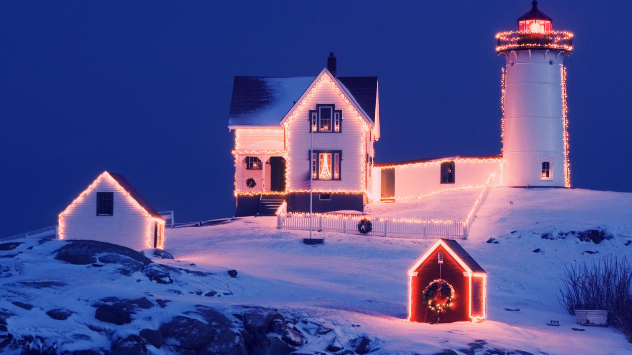 Обои Красиво украшенный дом с маяком на рождество