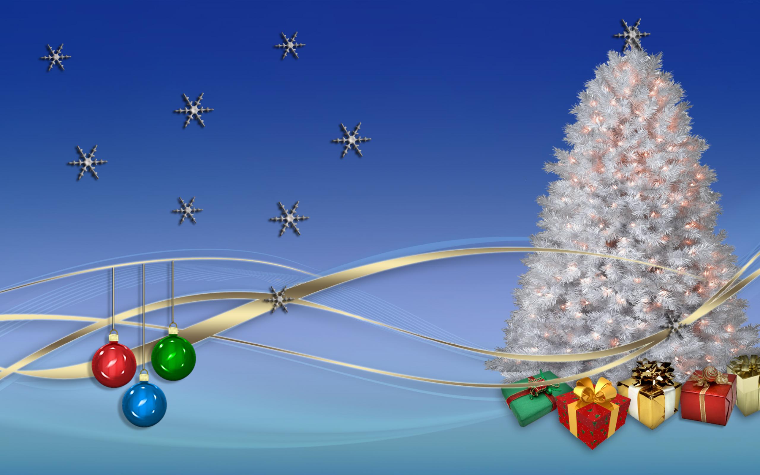 Обои Ёлка, подарки и звёзды на голубом фоне на рождество