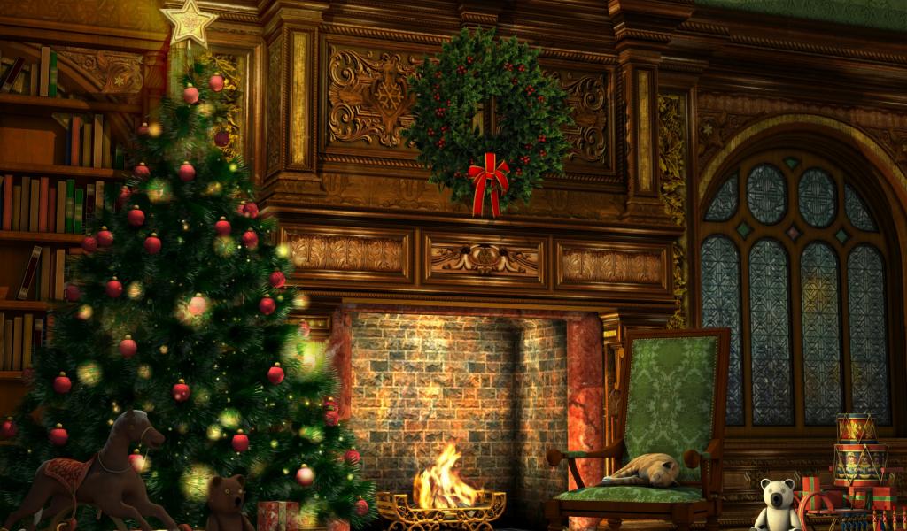 Обои Елка у камина на Рождество