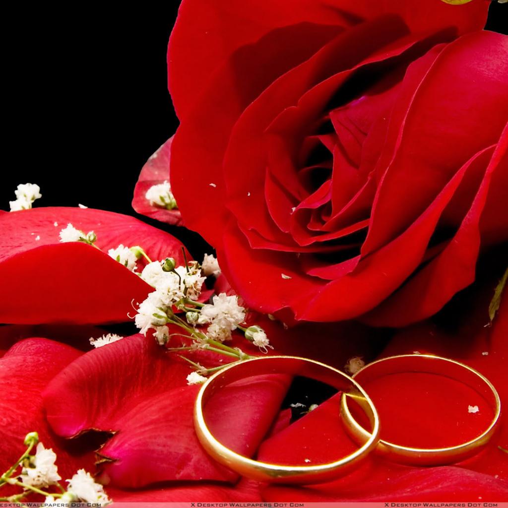 Обои Красная роза и свадебные кольца на чёрном фоне