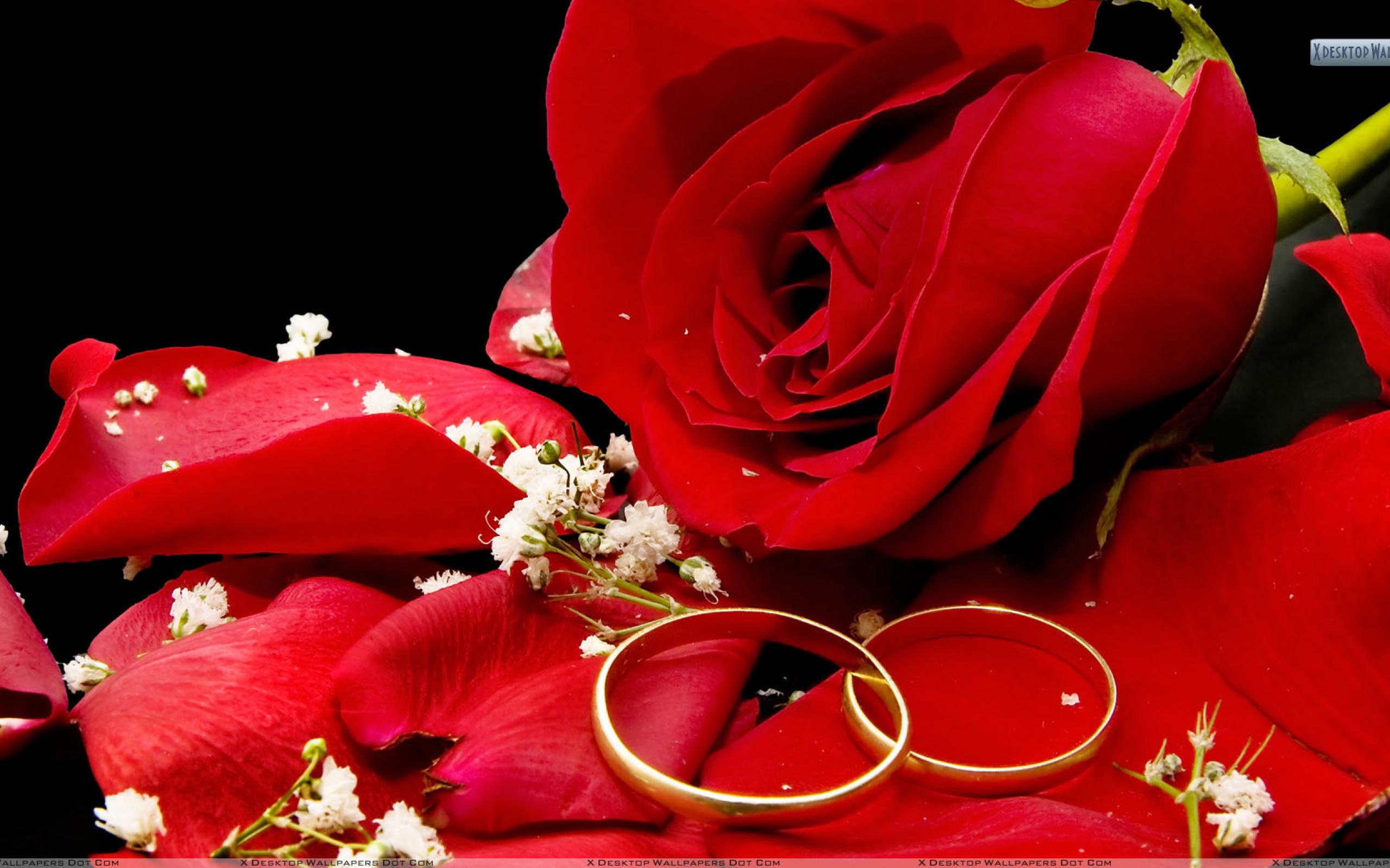 Обои Красная роза и свадебные кольца на чёрном фоне