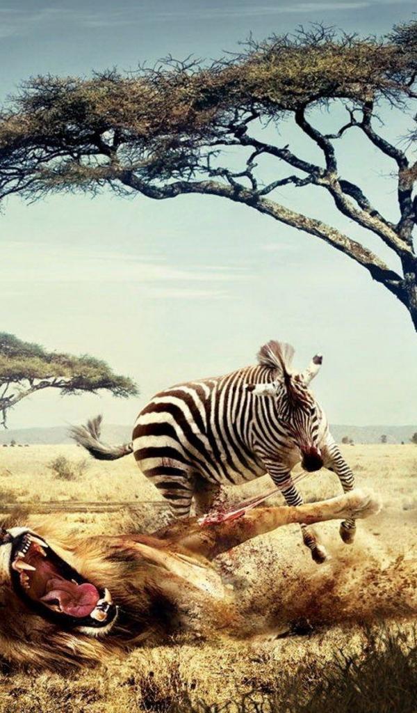 Обои Зебра напала на льва