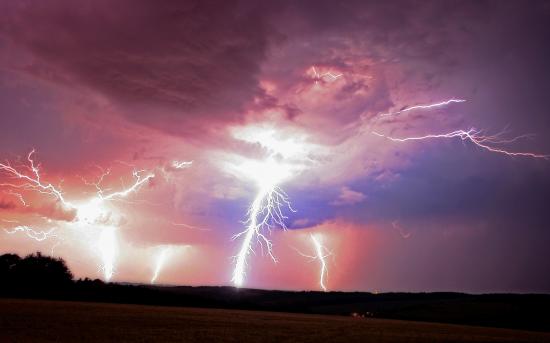 Обои Мощные разряды молний в розовых облаках