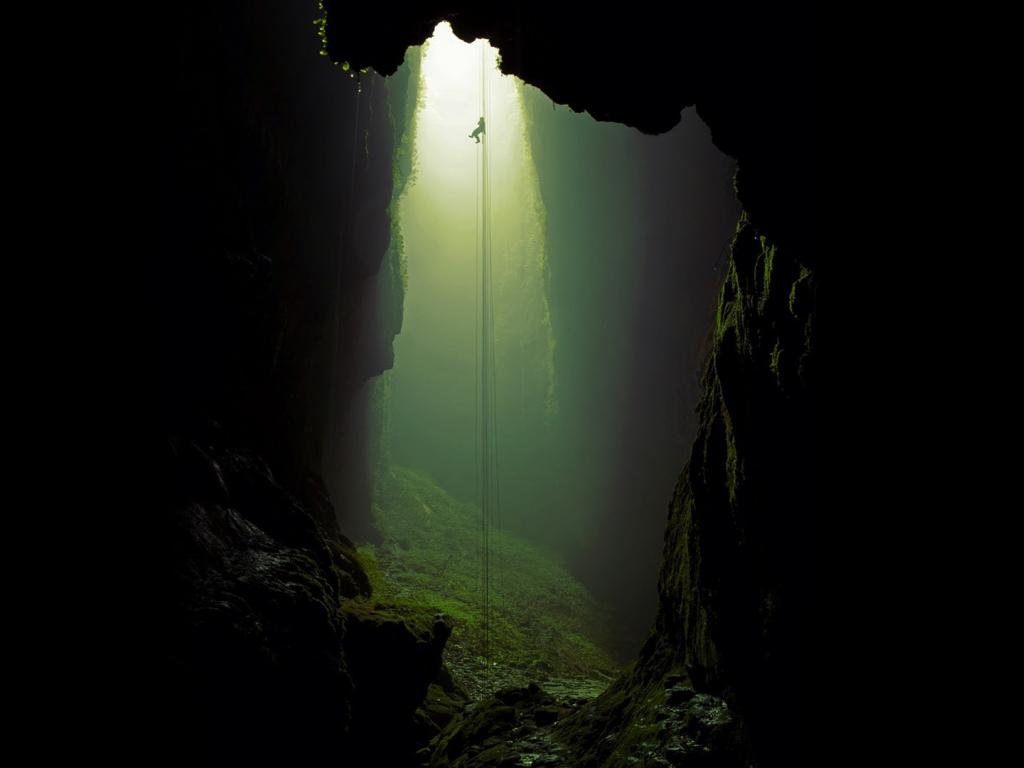 Обои Спелеолог спускается по канату в пещеру