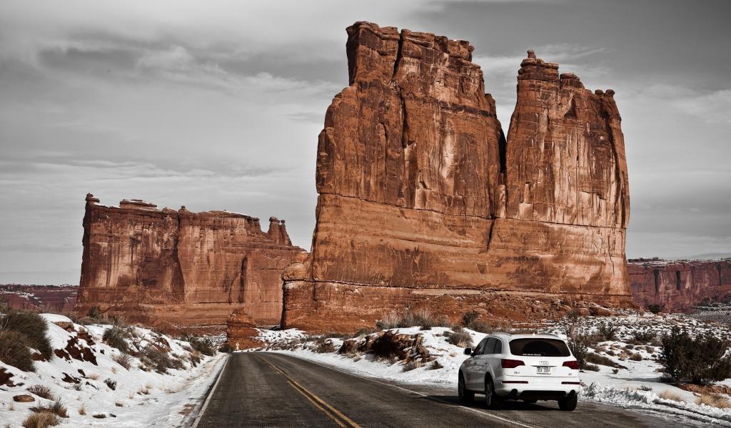 Обои Вертикальная коричневая скала у дороги