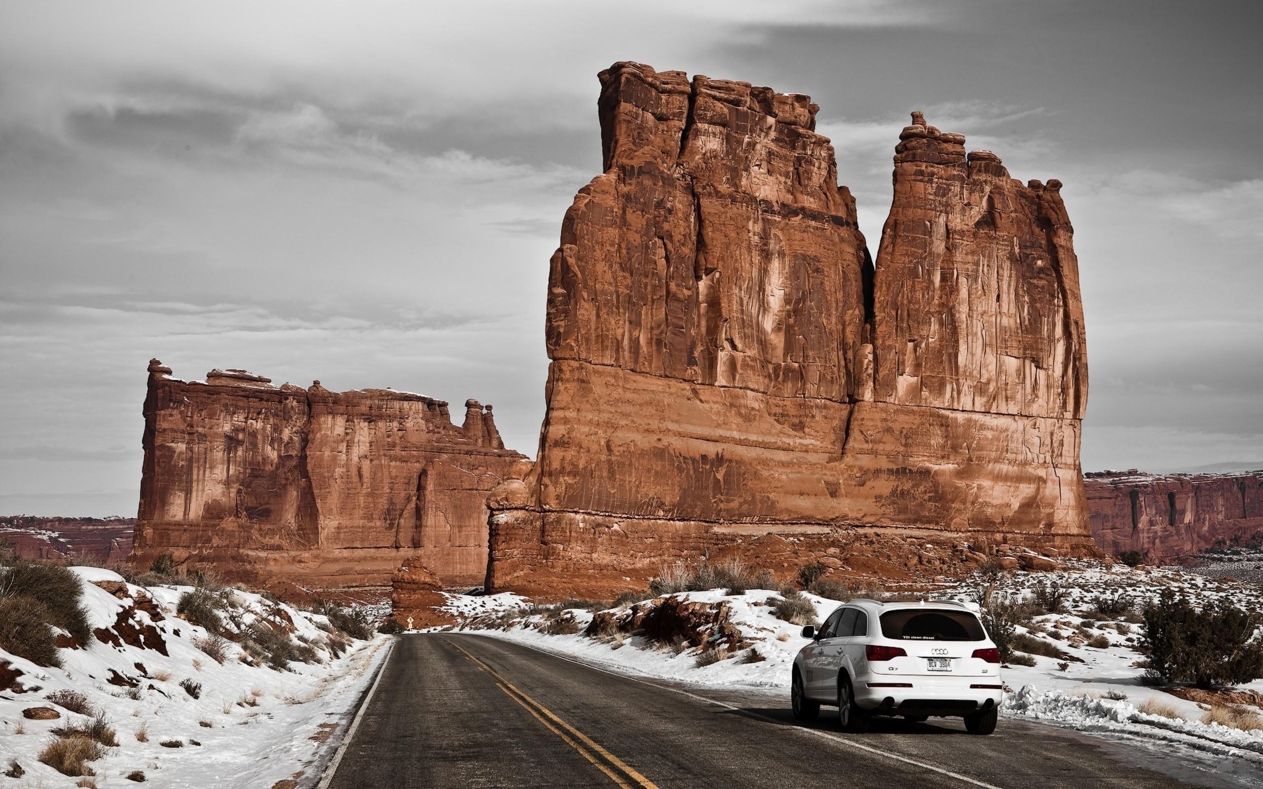 Обои Вертикальная коричневая скала у дороги