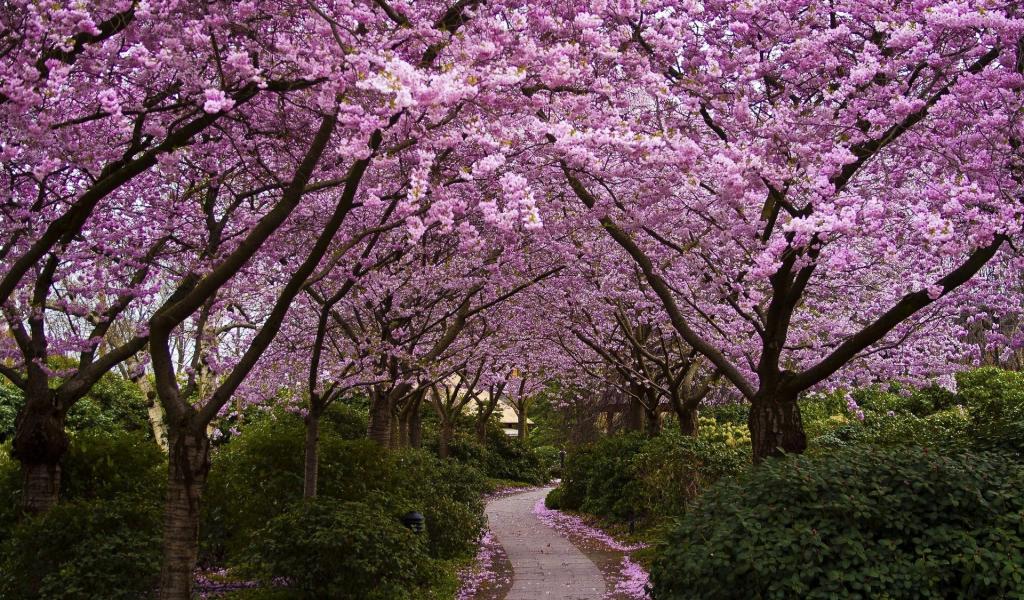 Обои Тропинка в саду с цветущей сакурой