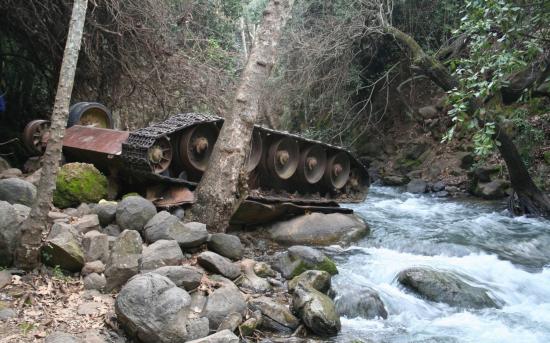 Обои Перевернутый танк в горном ручье