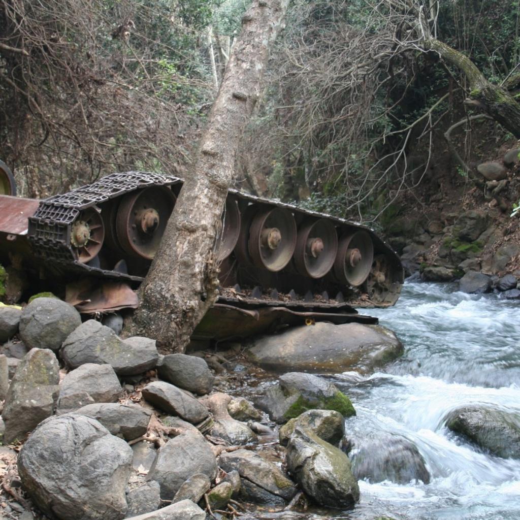 Обои Перевернутый танк в горном ручье