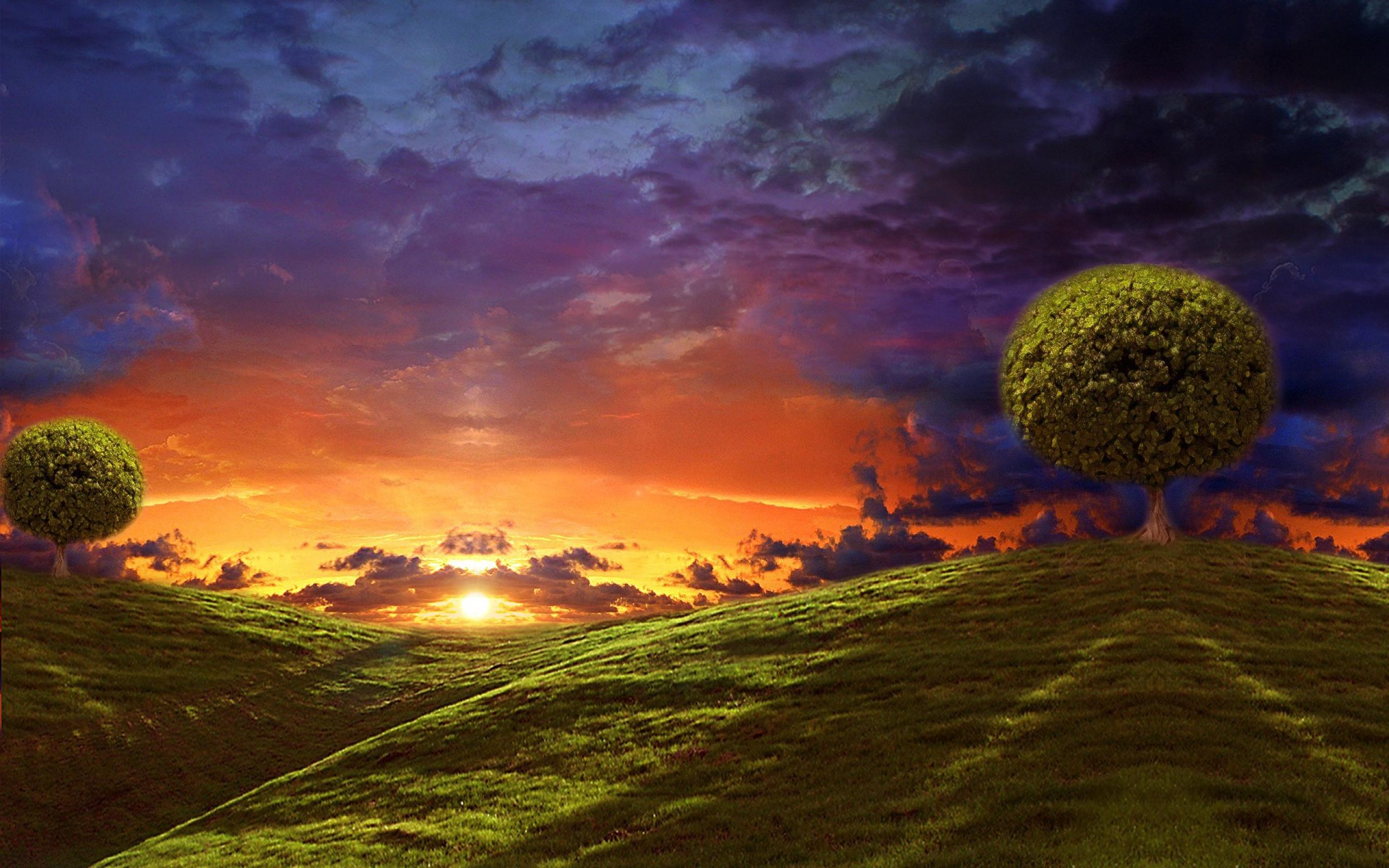 Обои Круглые кроны деревьев на вершинах холмов