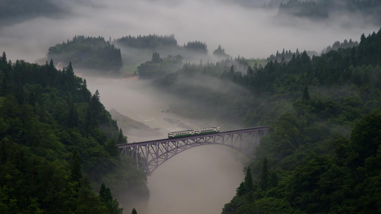 Обои Железнодорожный мост в виде арки над зеленым лесом и рекой