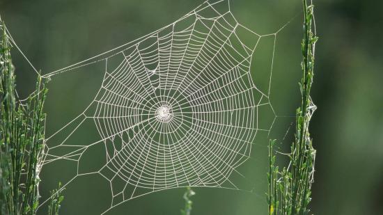 Обои Паутина между двух зеленых стеблей
