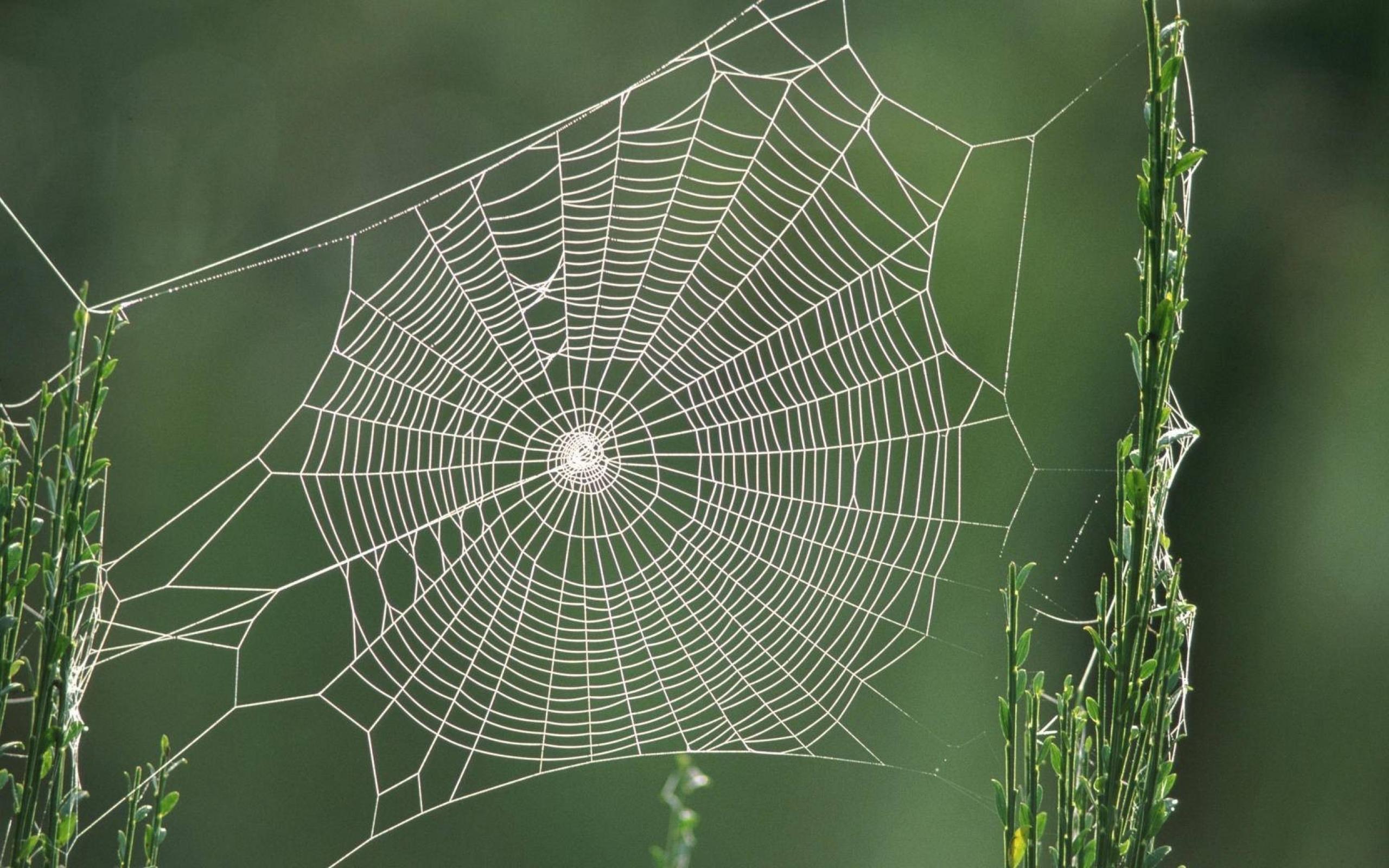 Обои Паутина между двух зеленых стеблей