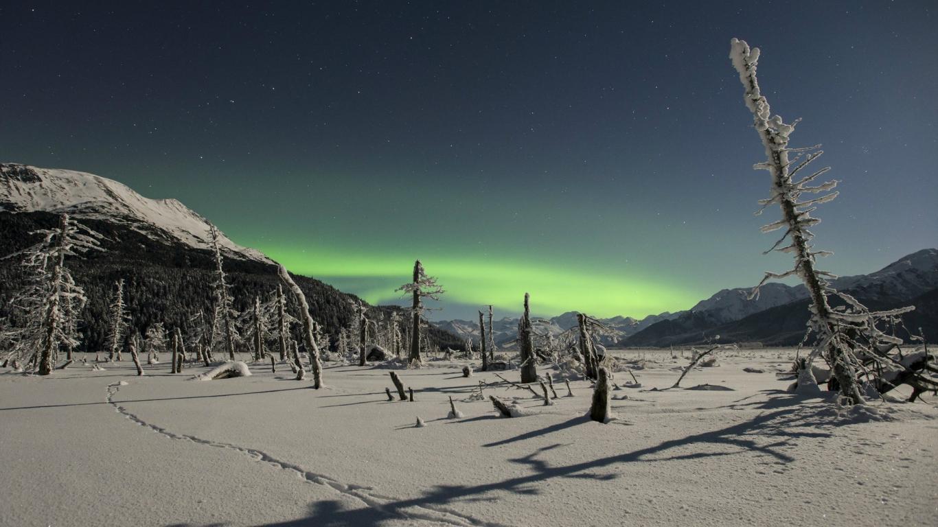 Обои Северное сияние над снежной пустыней