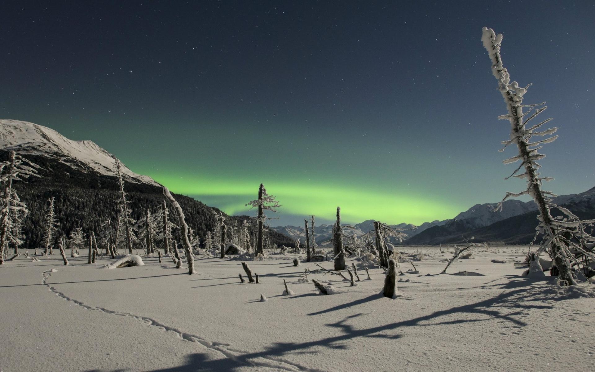 Обои Северное сияние над снежной пустыней