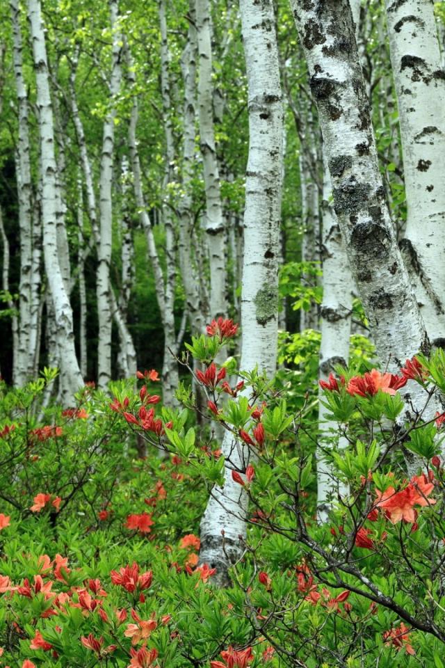 Обои Берёзы среди розовых листъев