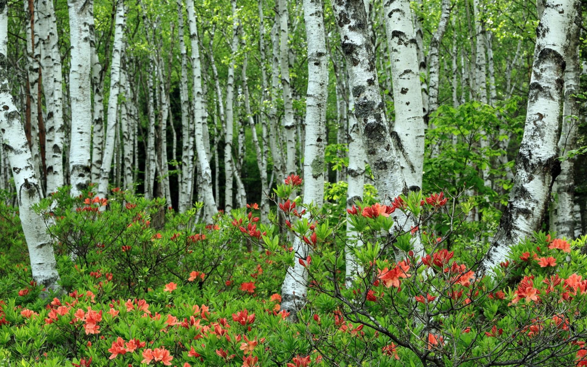 Обои Берёзы среди розовых листъев