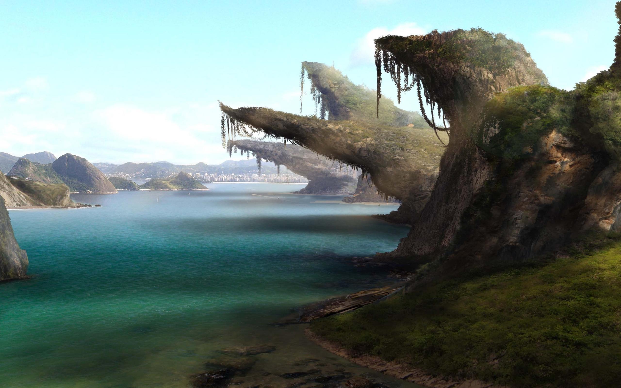 Обои Трава, Пейзаж, Скалы, Вода