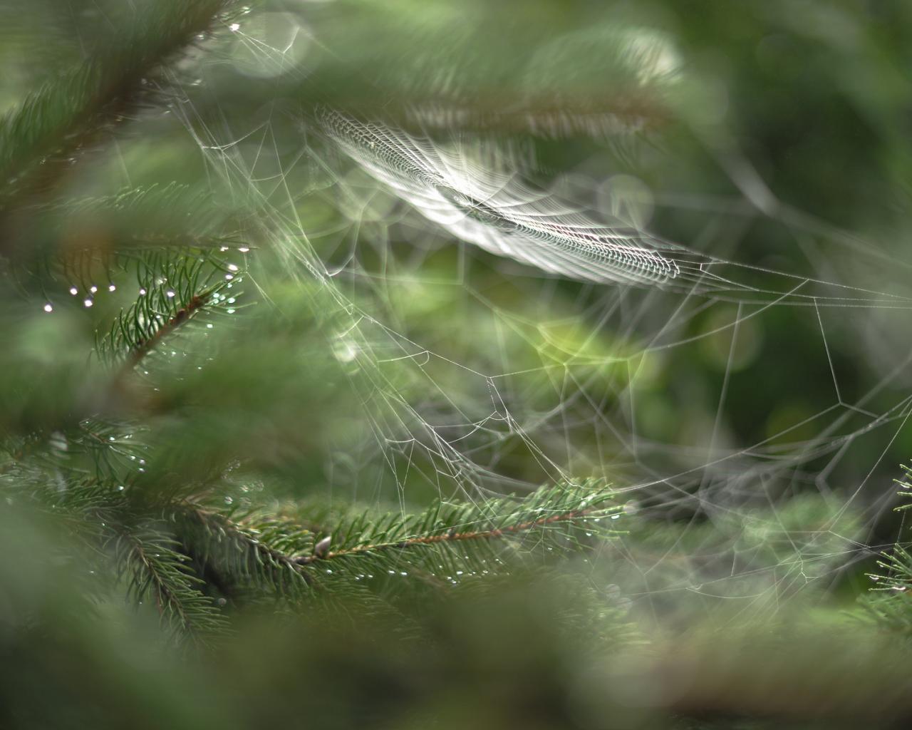 Обои Капли, Зелень, паутина, Макро