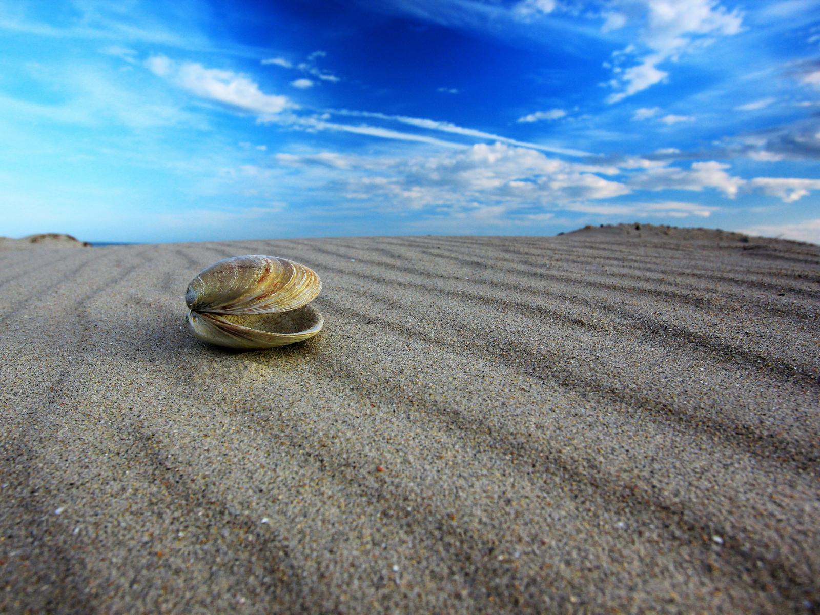 Обои Песок, Облачное небо, Ракушки, Макро