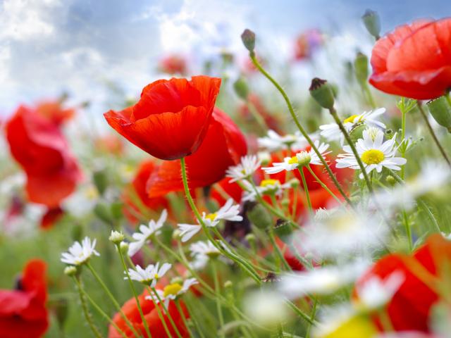 Обои Ромашки, Белые ромашки, Летнее время, Облачное небо