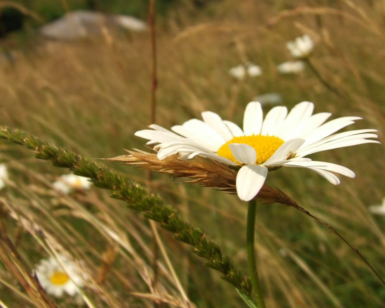 Обои Белые ромашки, Зеленая трава, Лепестки ромашки, колос
