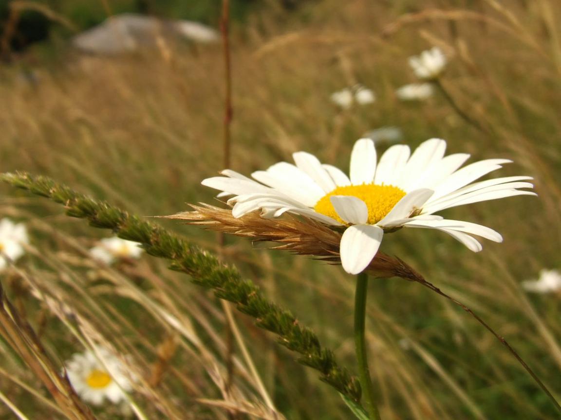 Обои Белые ромашки, Зеленая трава, Лепестки ромашки, колос