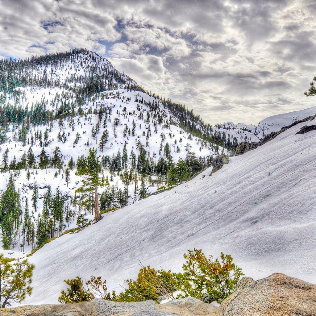 Обои Густой заснеженный лес в горах, спускающихся к морю