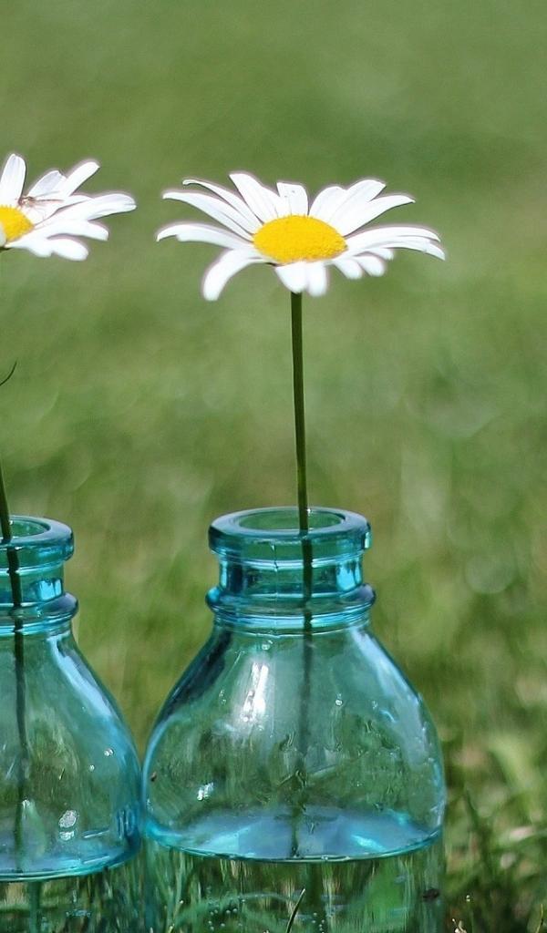Обои Tри ромашки в бутылках