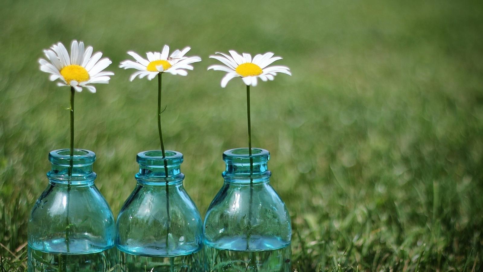 Обои Tри ромашки в бутылках