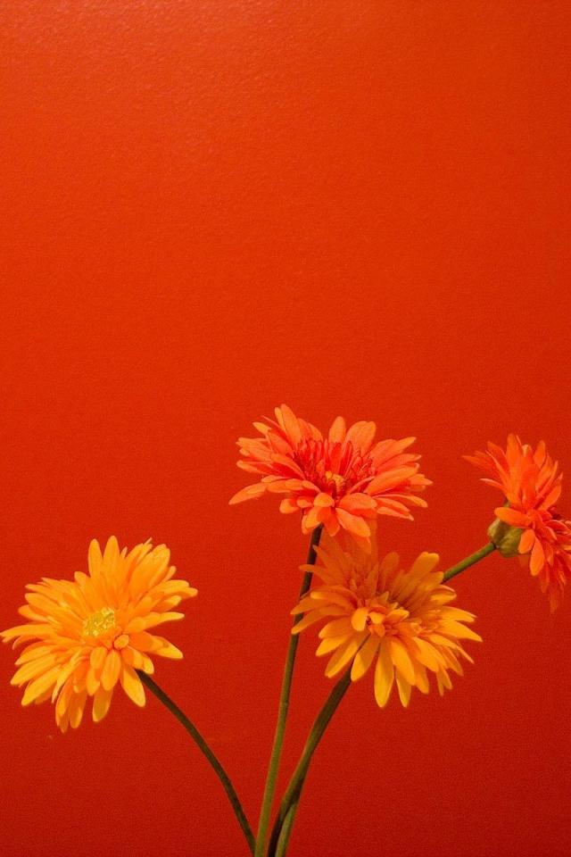 Обои Оранжевые цветы на красном фоне