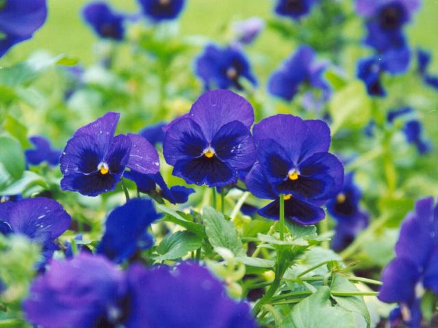 Обои Синие цветы анютины глазки зацвели на поляне в лесу