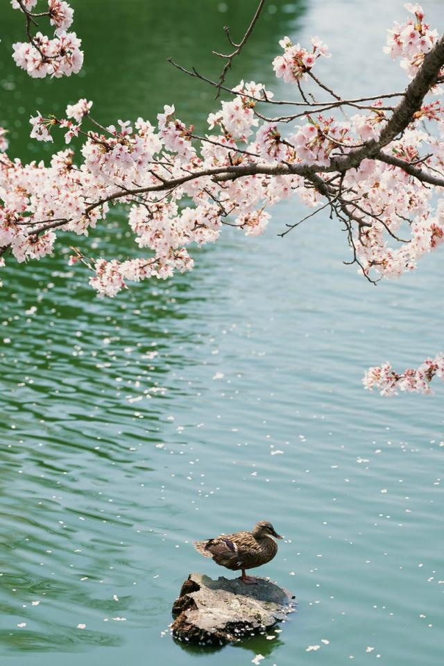 Обои Утка под цветущей вишней