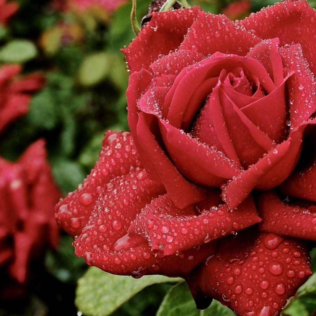 Обои Красивые красные розы в саду под дождём