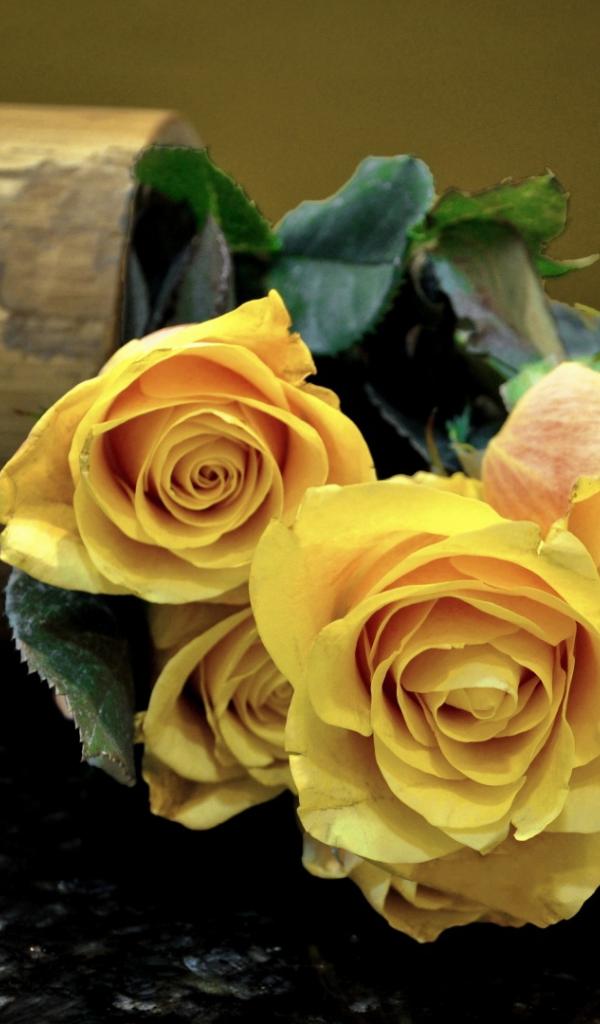 Обои Жёлтые розы на тёмном столе