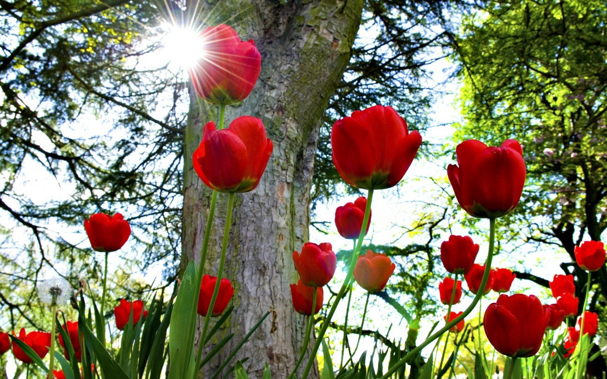 Обои Красные тюльпаны под солнцем
