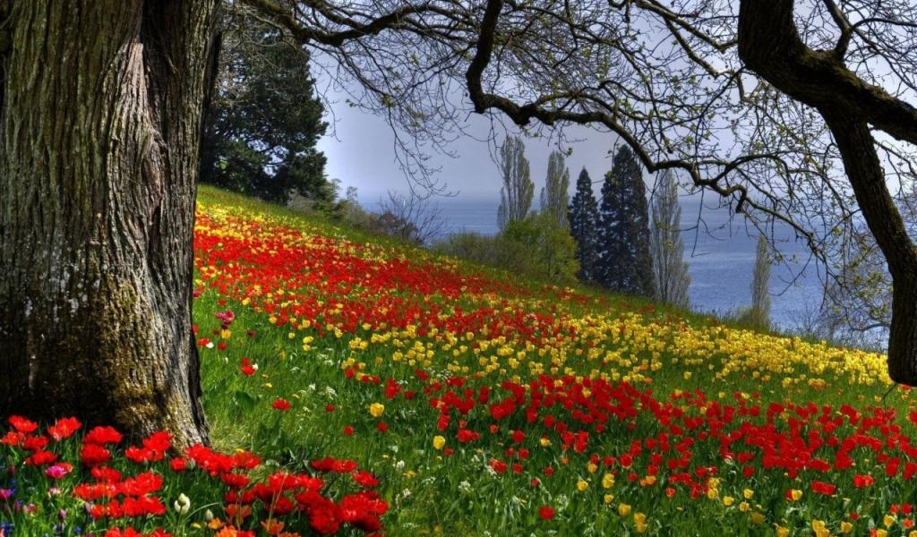 Обои Брюнетка в голубом платье у клумбы с тюльпанами