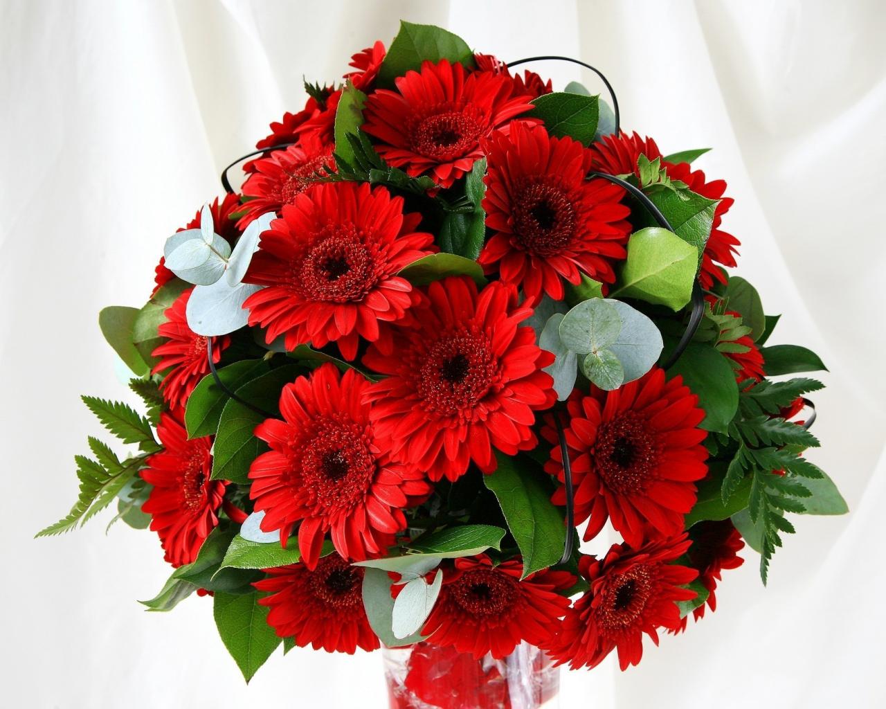 Обои Листья, белый фон, букет, герберы