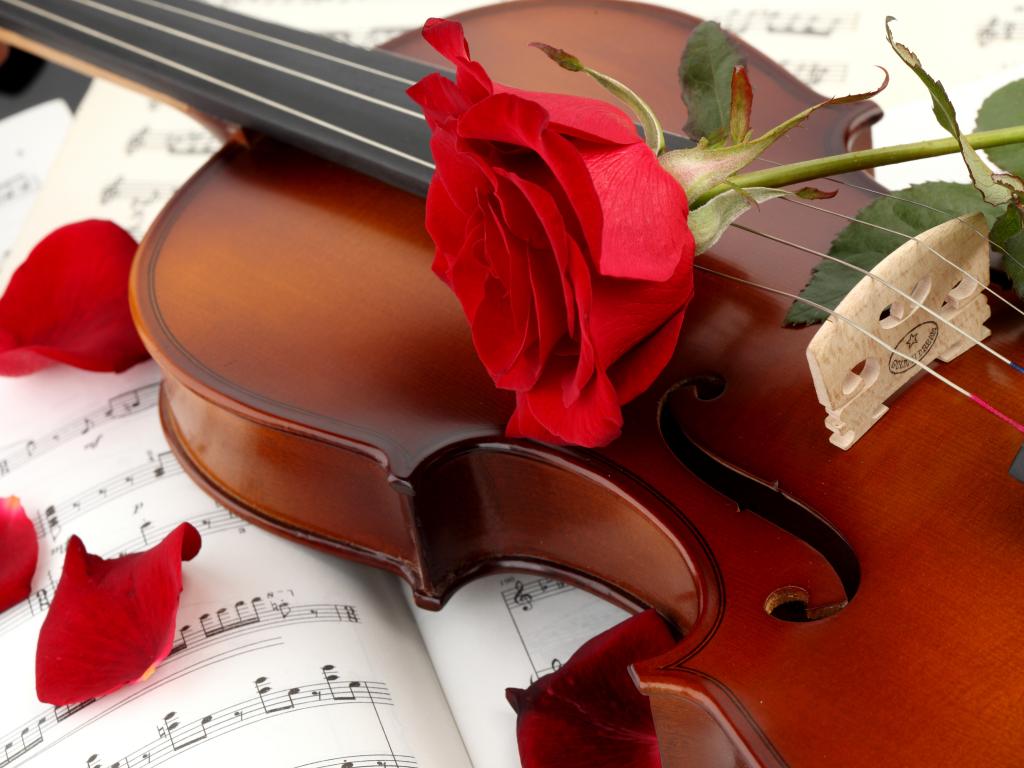 Обои Листья, Красная роза, Лепестки роз, скрипка