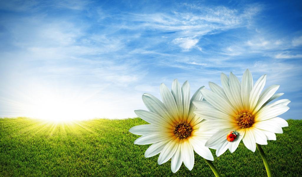 Обои Ромашки лето трава жуки