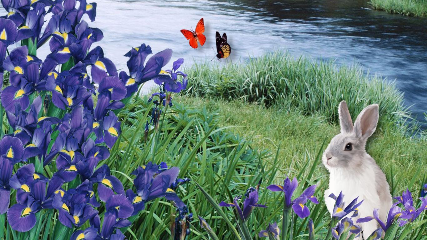 Обои Заяц среди ирисов