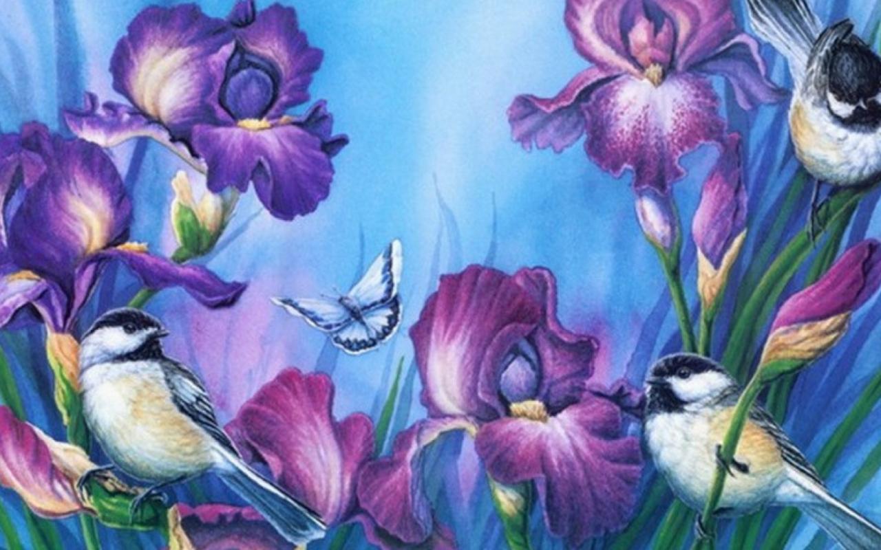 Обои Картина птицы на ирисах