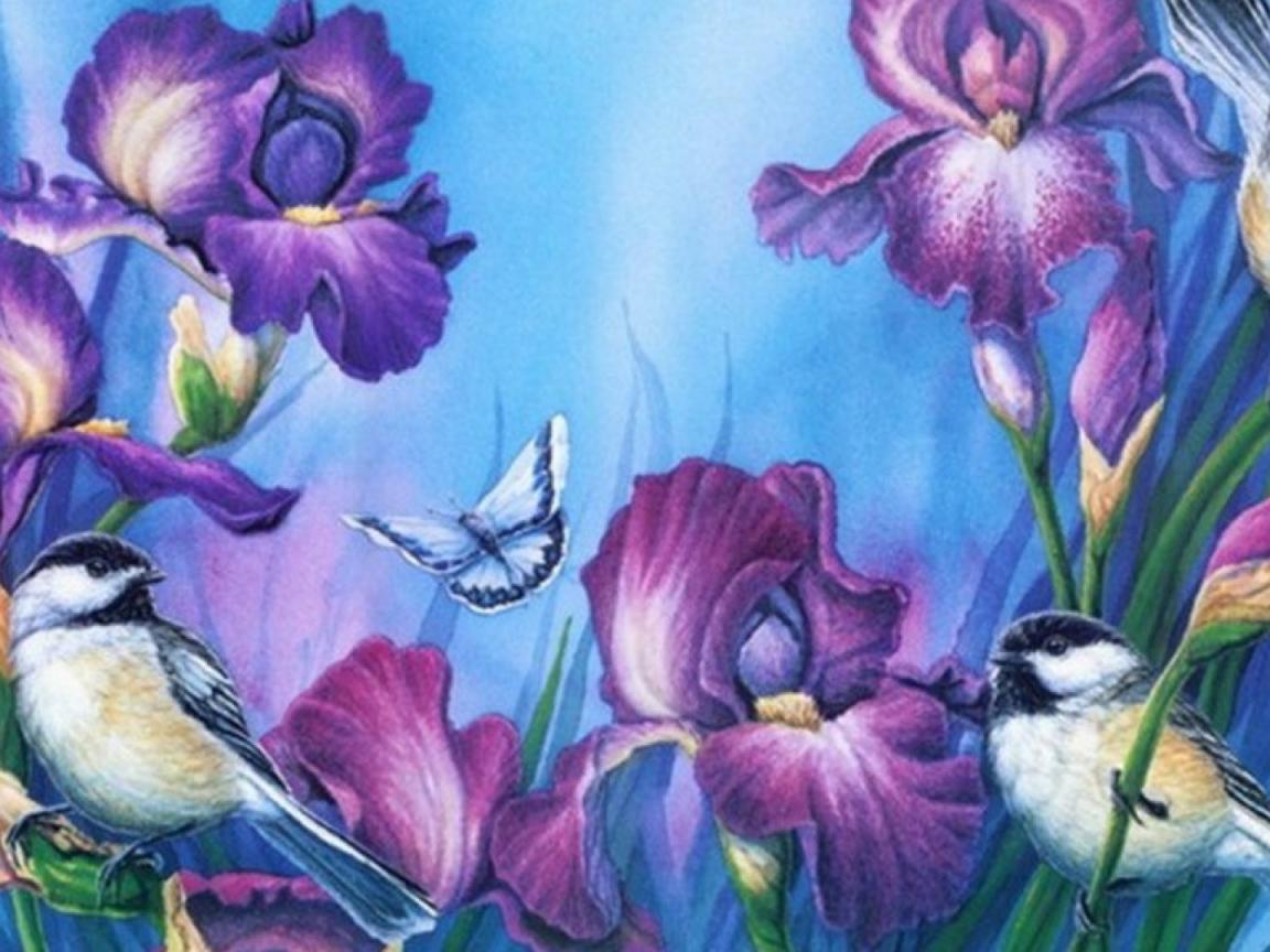 Обои Картина птицы на ирисах