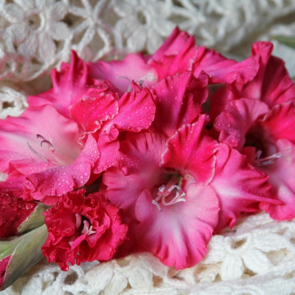 » Обои Красные гладиолусы на скатерти