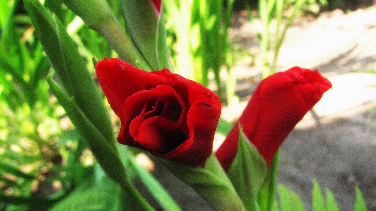Обои Красные гладиолусы в бутонах
