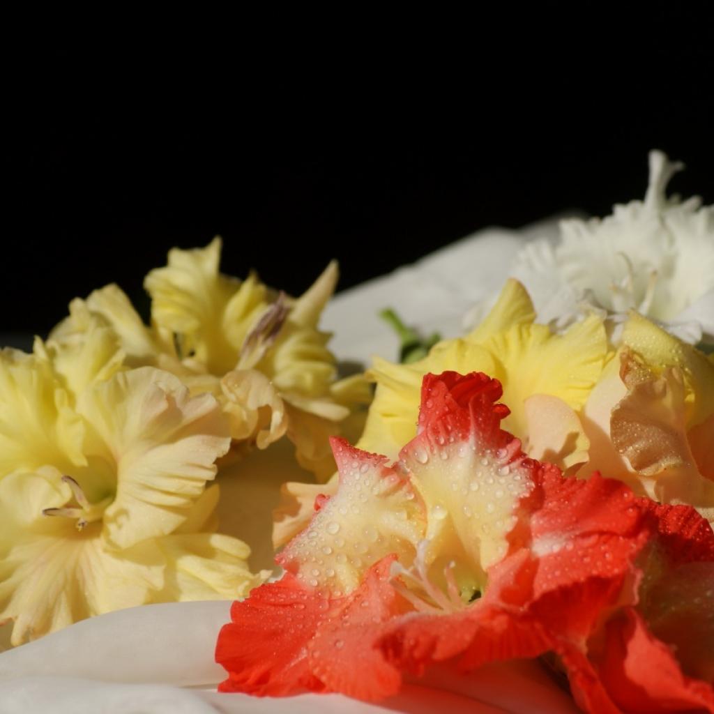 Обои Красные гладиолусы на скатерти