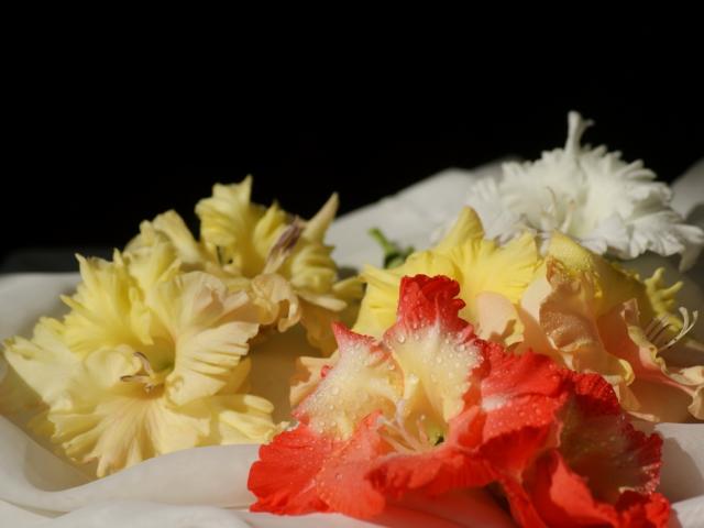 Обои Красные гладиолусы на скатерти