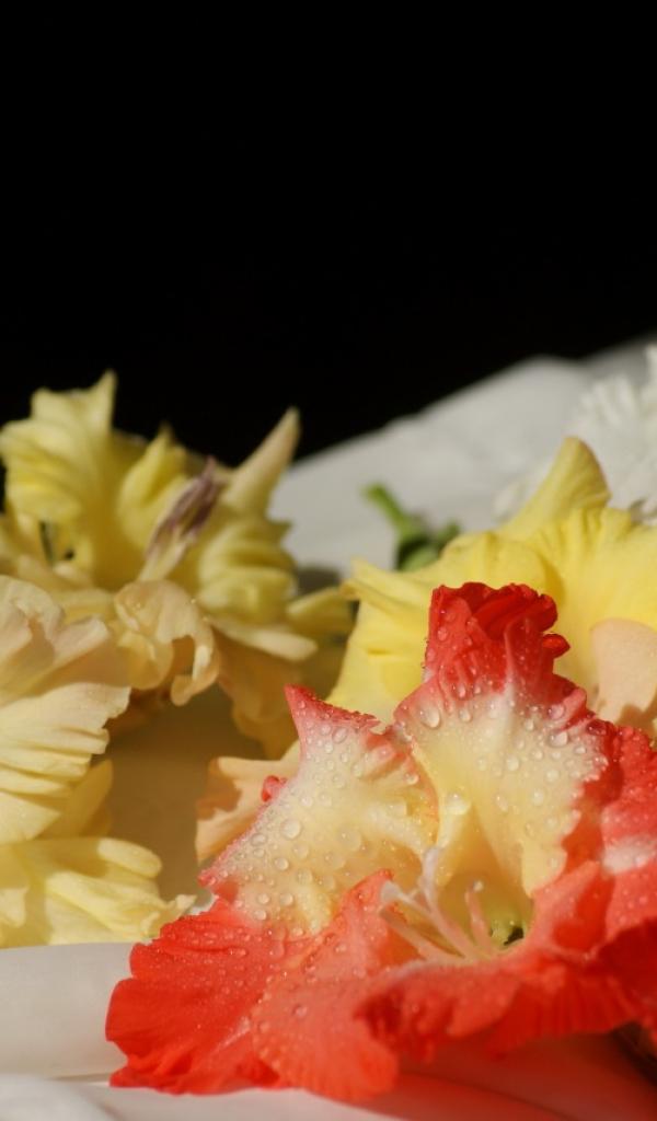 Обои Желтые и красные гладиолусы
