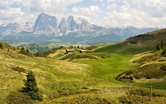 Обои Фермы на зеленых полях среди гор