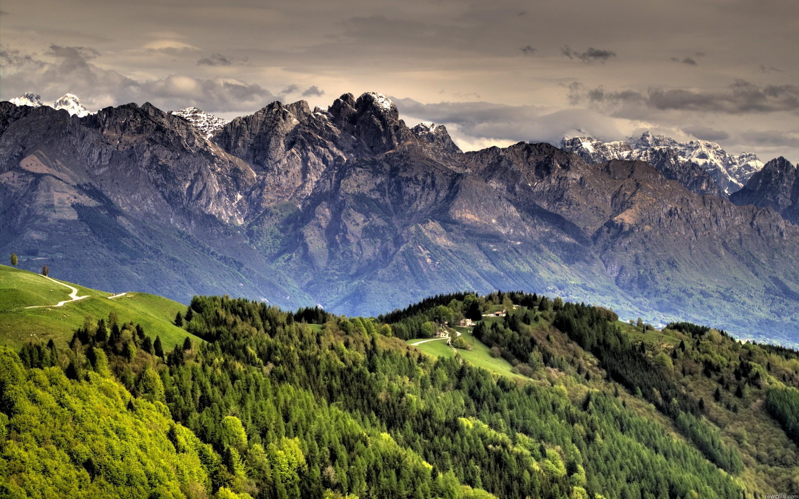 Обои Горный пейзаж с дорогой и лесом